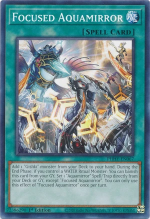 Aggiungi 1 mostro "Gishki" dal tuo Deck alla tua mano. Durante la End Phase, se controlli un Mostro Rituale ACQUA: puoi bandire questa carta dal tuo Cimitero; Posiziona 1 Magia/Trappola "Acquaspecchio" direttamente dal tuo Deck o Cimitero, eccetto "Acquaspecchio Focalizzato". Puoi utilizzare questo effetto di "Acquaspecchio Focalizzato" una sola volta per turno. |