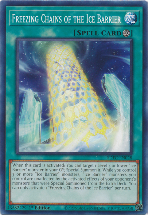 Cuando esta carta es activada: puedes seleccionar 1 monstruo "Barrera de Hielo" de Nivel 4 o menor en tu Cementerio; Invócalo de Modo Especial. Mientras controles 3 o más monstruos "Barrera de Hielo", los monstruos "Barrera de Hielo" que controles no son afectados por los efectos activados de los monstruos de tu adversario que fueron Invocados de Modo Especial desde el Deck Extra. Sólo puedes activar 1 "Cadenas Congeladas de la Barrera de Hielo" por turno. |