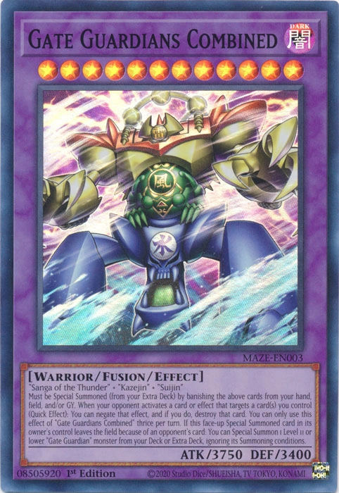"Sanga del Trueno" + "Kazejin" + "Suijin" Debe ser Invocado de Modo Especial (desde tu Deck Extra) desterrando las cartas mencionadas arriba en tu mano, Campo y/o Cementerio. Cuando tu adversario activa una carta o efecto que selecciona una o más cartas que controlas (Efecto Rápido): puedes negar ese efecto y, si lo haces, destruye esa carta. Sólo puedes usar este efecto de "Guardián de la Puerta Combinado" tres veces por turno. Si esta carta Invocada de Modo Especial boca arriba controlada por su dueño deja el Campo por una carta del adversario: puedes Invocar de Modo Especial, desde tu Deck o Deck Extra, 1 monstruo "Guardián de la Puerta" de Nivel 11 o menor ignorando sus condiciones de Invocación. |