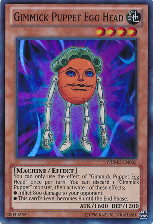 Du kannst den Effekt von „Gimmick-Marionette Eierkopf“ nur einmal pro Spielzug verwenden. Du kannst 1 „Gimmick-Marionette“-Monster abwerfen und dann 1 dieser Effekte aktivieren; ● Füge deinem Gegner 800 Schaden zu. ● Die Stufe dieser Karte wird bis zur End Phase zu 8.