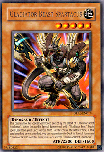 Esta carta no puede ser Invocada de Modo Especial excepto mediante el efecto de "Bestia Gladiador Hoplomus". Cuando esta carta es Invocada de Modo Especial agrega 1 Carta Mágica de Equipo "Bestia Gladiador" de tu Deck a tu mano. Al final de la Battle Phase, si esta carta atacó o fue atacada, puedes devolverla al Deck para Invocar de Modo Especial 1 monstruo "Bestia Gladiador" de tu Deck, excepto "Bestia Gladiador Spartacus". |