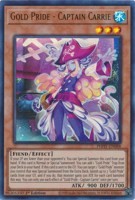 Falls du weniger LP hast als dein Gegner: Du kannst diese Karte als Spezialbeschwörung von deiner Hand beschwören. Falls diese Karte als Normal- oder Spezialbeschwörung beschworen wird: Du kannst deiner Hand 1 „Goldstolz“-Falle von deinem Deck hinzufügen. Falls diese Karte auf den Friedhof gelegt wird: Du kannst 1 „Goldstolz“-Monster wählen, das du kontrollierst und das als Spezialbeschwörung vom Extra Deck beschworen wurde; verbanne bis zu 3 „Goldstolz“-Karten von deinem Friedhof und falls du dies tust, erhält jenes Monster für jede auf diese Art verbannte Karte 500 ATK. Du kannst jeden Effekt von „Goldstolz - Kapitänin Carrie“ nur einmal pro Spielzug verwenden. |