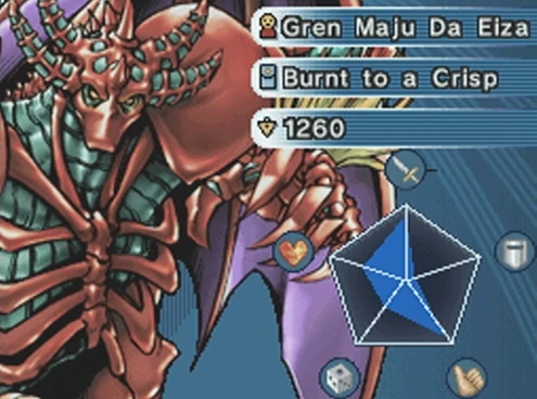 Gren Maju Da Eiza appears in the video game, Yu-Gi-Oh! World Championship 2007. He appears as a Level Five Limited Duelist and he challenges the player to only included FIRE monsters in the Deck. By beating him, the player gets closer to unlocking Level Six Limited Duelists and a new Booster Pack.