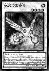 | Japanese | 虹光の宣告者 | ①:このカードがモンスターゾーンに存在する限り、お互いの手札・デッキから墓地へ送られるモンスターは墓地へは行かず除外される。②:モンスターの効果・魔法・罠カードが発動した時、このカードをリリースして発動できる。その発動を無効にし破壊する。③:このカードが墓地へ送られた場合に発動できる。デッキから儀式モンスター1体または儀式魔法カード1枚を手札に加える。 |
