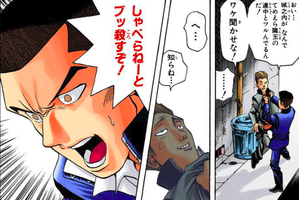 Honda interrogates a member of Hirutani's gang.