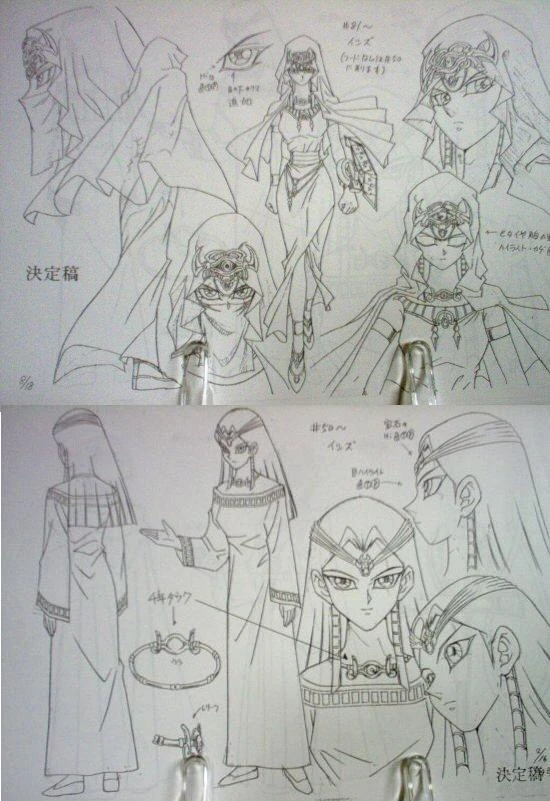 During the Battle City tournament she wears a cream colored sleeveless one-piece dress with the bottom similar to a sarong, a matching waist length veil which widens and spreads below her shoulders and gold sandals. Her jewelry consists of gold bracelets, ankle bracelets, armbands and brooch bearing the Eye of Wdjat on her veil. She initially wears a piece of cloth over her mouth to conceal her identity.