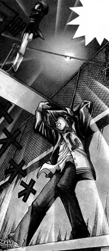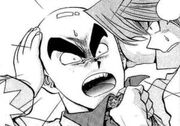 Jonouchi and Dark Yugi helped Anzu to safety and Dark Yugi told Jonouchi to touch the key off the professor to return him to normal. He complied, but also noticed Yugi was acting different. After seeing everyone was okay, Jonouchi told Shadi he was unwelcome here. After Shadi left, Anzu asked Jonouchi if Yugi seemed different to him, but after they approach Yugi, he had turned back his normal self. When Yoshimori noticed some of his teeth were missing, Jonouchi tried blaming Anzu.[23]