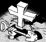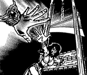 Jonouchi distracted the zombie Yoshimori from the others, by having him chase him around the building. Among Jonouchi's efforts to snap the professor back to normal, he punched him the face, knocking out more of his teeth[20] and sprayed him with a fire extinguisher. Eventually, Yoshimori pushed him out a third floor window. Jonouchi managed to get onto a ledge and spotted Anzu, who was being used in the Trial of the Mind Shadow Game, standing motionless on a board hanging over the edge up above him.[21] He climbed up to rescue her, but was followed by the professor. Still hassled by the professor, Jonouchi held onto Anzu's board as its supporting rope began to break.[22] Seeing Yugi's friends work together and trusting each other, caused Shadi's ushebti to break, letting his Millennium Key, slide down a rope to Anzu, returning her to normal.[23]