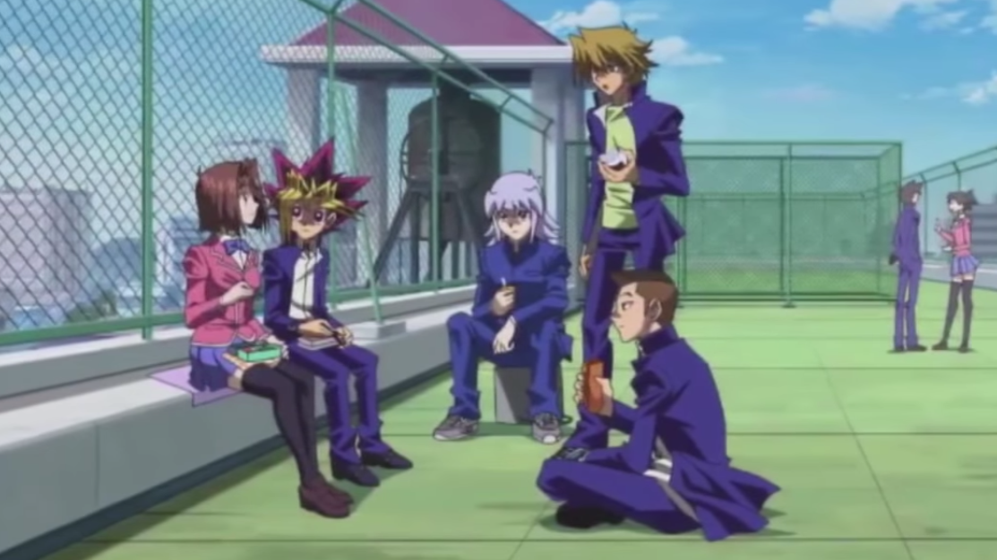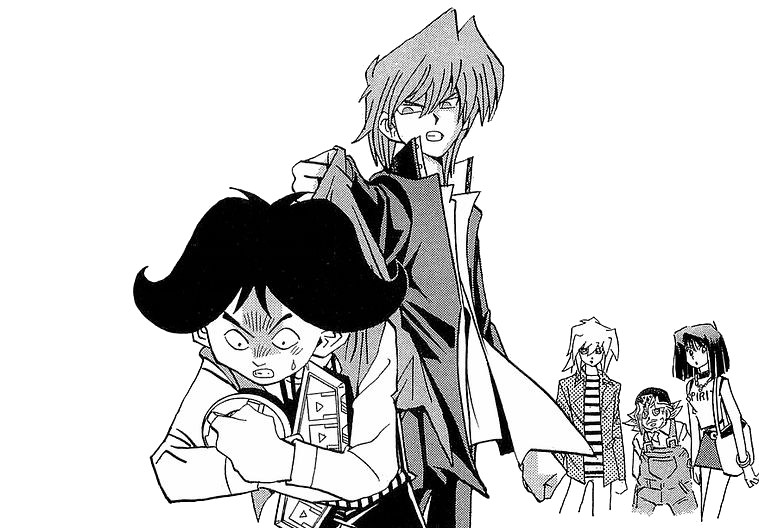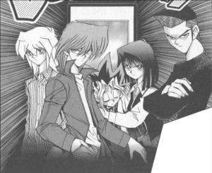 Jonouchi along with Honda used to bully Yugi at school. Jonouchi was annoyed at how Yugi would let himself get pushed around and claimed his bullying was teaching Yugi how to be a man and even offered Yugi to punch him back, although Yugi hates violence. After he and Honda swiped the box containing the pieces of the Millennium Puzzle, Jonouchi was told off by Anzu and left the room, but managed to secretly take a piece of the puzzle beforehand.[8]