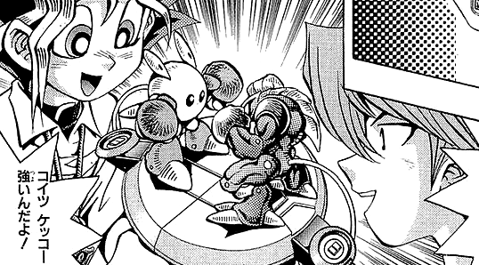 Jonouchi starts out as a weak player after taking-up Duel Monsters, but becomes more powerful as he learns from Yugi and Dark Yugi and fights to protect people he loves.