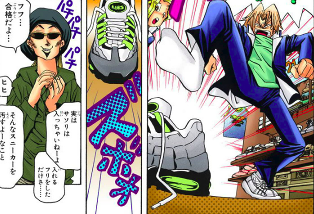 Having had his eyes on a pair of Air Muscle shoes for a long time, Jonouchi took Honda and Yugi to the Junky Scorpion shop, to buy a pair. The owner refused to sell Jonouchi the shoes unless he puts his foot inside one of the shoes, while there was a scorpion inside. Jonouchi did it and found out that there really was no scorpion inside; it had just been a test and the owner sold him the shoes for half price. Shortly after leaving the shop, Jonouchi, Yugi and Honda were ambushed by a group of thugs, who stole the shoes. The three boys tracked down the thugs afterwards. Jonouchi and Honda beat them up and learned that the store owner paid them to get back the shoes. By the time Jonouchi and Honda returned to the shop, Yugi already had gotten the shoes back and the owner was being rushed to the hospital for scorpion stings. Unaware that he changed to Dark Yugi and defeated the owner in coin in sneaker, Yugi returned the shoes to Jonouchi, with a hole in one, which Jonouchi considered a battle scar.[15]