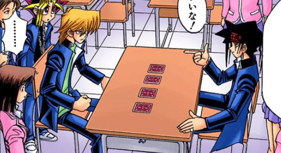 Jonouchi took up Duel Monsters, having been introduced by Sugoroku and Yugi at their shop, where Sugoroku showed them his rare card, the "Blue-Eyes White Dragon". Jonouchi made plans to play Duel Monsters at school the next day with Yugi, just before Seto Kaiba arrived. Learning that Kaiba plays Duel Monsters, Jonouchi invited him to join them, but Kaiba ridiculed his cards and told him to come back after collecting at least 10,000. The next day at school Jonouchi was defeated by Yugi and asked him for a rematch, unintentionally distracting Yugi from approaching Kaiba, who just stole the "Blue-Eyes White Dragon" card.[16]