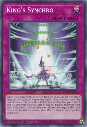 Wenn ein Monster deines Gegners einen Angriff gegen ein Synchromonster deklariert, das du kontrollierst: Annulliere den Angriff, dann kannst du den Rest des Effekts dieser Karte ausführen. Verbanne jenes Synchromonster, das du kontrollierst, und 1 Empfänger von deinem Friedhof und falls du dies tust, beschwöre 1 Synchromonster, dessen Stufe der Summe der Stufen entspricht, welche die verbannten Monster hatten, als Spezialbeschwörung von deinem Extra Deck. (Dies wird als Synchrobeschwörung behandelt.) |