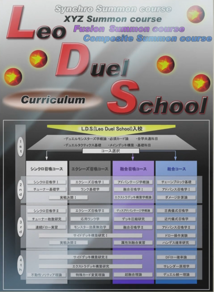 The Leo Institute of Dueling (often abbreviated as the Leo Institute or as LID), known as Leo Duel School (レオ・デュエル・スクール Reo Dyueru Sukūru, often abbreviated as LDS Erudīesu) in the Japanese version, is a preparatory Duel school located in Paradise City. It is the most prestigious of the Duel schools and is owned by the Leo Corporation.[2] The school offers courses for Fusion Summon, Synchro Summon and Xyz Summon.[3] Declan Akaba also wants to include Pendulum Summon in the curriculum. The school is currently headed by Henrietta Akaba.