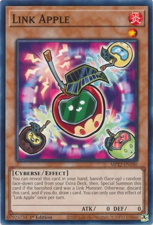 Você pode revelar este card na sua mão; bana (com a face para cima) 1 card aleatório com a face para baixo do seu Deck Adicional e, depois, Invoque este card por Invocação-Especial se o card banido era um Monstro Link. Caso contrário, descarte este card e, se isso acontecer, compre 1 card. Você só pode usar este efeito de "Maçã Link" uma vez por turno. |