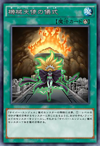 | Japanese | 機械天使の儀式 | 「サイバー・エンジェル」儀式モンスターの降臨に必要。①:レベルの合計が儀式召喚するモンスターのレベルと同じになるように、自分の手札・フィールドのモンスターをリリースし、手札から「サイバー・エンジェル」儀式モンスター1体を儀式召喚する。 |