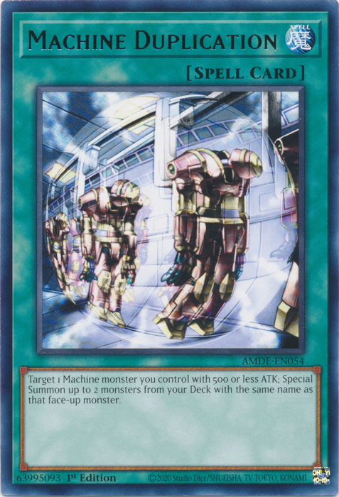 Selecciona 1 monstruo Máquina que controles y que tenga 500 ATK o menos; Invoca de Modo Especial, desde tu Deck, hasta 2 monstruos con el mismo nombre que ese monstruo boca arriba. |