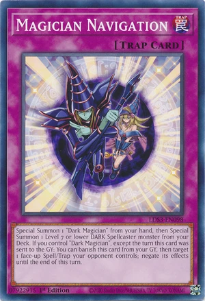 Invoque por Invocação-Especial 1 "Mago Negro" da sua mão e, depois, Invoque por Invocação-Especial 1 monstro Mago de TREVAS de Nível 7 ou menos do seu Deck. Se você controlar "Mago Negro", exceto no turno em que este card foi enviado para o Cemitério: você pode banir este card do seu Cemitério e, depois, escolha 1 Magia/Armadilha com a face para cima que seu oponente controla; negue seus efeitos até o final deste turno. |