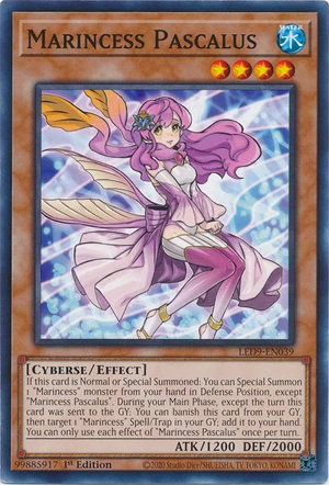 Si cette carte est Invoquée Normalement ou Spécialement : vous pouvez Invoquer Spécialement 1 monstre "Marincesse" ("Pascalus Marincesse" exclu) depuis votre main en Position de Défense. Durant votre Main Phase, sauf le tour où cette carte a été envoyée au Cimetière : vous pouvez bannir cette carte depuis votre Cimetière, puis ciblez 1 Magie/Piège "Marincesse" dans votre Cimetière ; ajoutez-le à votre main. Vous ne pouvez utiliser chaque effet de "Pascalus Marincesse" qu'une fois par tour. |