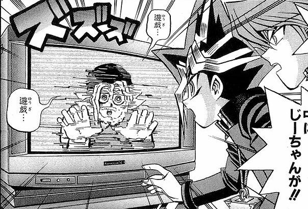When Yugi played the videotape Pegasus sent him, Pegasus appeared on screen and, despite claiming to be a prerecording, challenged him to a Duel to test his skill. Using his mind reading skills, Pegasus predicted and countered Yugi's moves. Upon realizing the Duel was a Shadow Game, Dark Yugi took over from Yugi.[21] Dark Yugi suspected the video contained subliminal messages telling him what cards to play, allowing Pegasus to prerecord moves to respond perfectly. Dark Yugi ignored his subconscious decision for one move, which resulted in Pegasus counteracting with a weaker monster.[22] However the video footage showed Pegasus' monster being destroyed and Pegasus claimed to have known that would happen and took the hit on purpose. With limited footage left on the tape, Pegasus imposed a 15 minute time limit. In the last few seconds, Dark Yugi's victory was apparent, but the time ran out, making Pegasus win due to having higher Life Points. As Dark Yugi's Penalty Game and a means of ensuring he would take part in Duelist Kingdom, Pegasus sealed the soul of Sugoroku Mutou in the videotape. He then showed Dark Yugi the Millennium Eye, explaining he had used it to read his mind.[23]
