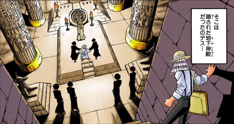 Pegasus was surprised that Shadi seemed to have read his mind, so he secretly followed him and the other prosecutors. They went to an underground temple where they put the thief on trial to see if he was chosen by the Ring. The ring was put on him, which resulted in his body burning up, killing him. Pegasus was caught spying on the ritual and taken down to Shadi. He begged to be let go and promised not to tell anyone what he had seen. However he was only permitted to leave if he became bearer of a Millennium Item, so he was to be tested by the Millennium Eye. If he were deemed worthy, Shadi said he would be granted his dearest wish. The other men cut out Pegasus left eye and inserted the Millennium Eye in its socket. Pegasus passed the test and for a moment was embraced by an apparition of Cyndia.[4]