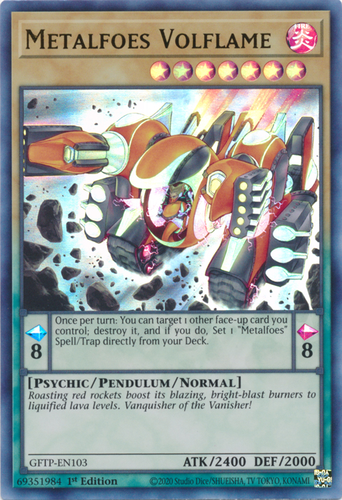 - Einmal pro Spielzug: Du kannst 1 andere offene Karte wählen, die du kontrollierst; zerstöre sie und falls du dies tust, setze 1 „Metallfose“-Zauber/Falle direkt von deinem Deck.