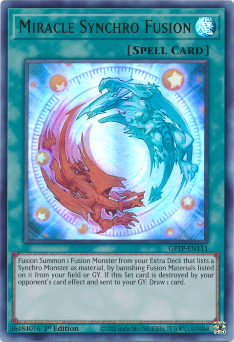 Beschwöre 1 Fusionsmonster, das ein Synchromonster als Material aufführt, als Fusionsbeschwörung von deinem Extra Deck, indem du das Fusionsmaterial, das auf ihm aufgeführt ist, von deiner Spielfeldseite oder deinem Friedhof verbannst. Falls diese gesetzte Karte durch einen Karteneffekt deines Gegners zerstört und auf deinen Friedhof gelegt wird: Ziehe 1 Karte.