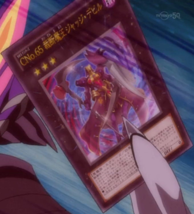 | Japanese | CNo.65 裁断魔王ジャッジ・デビル | 闇属性レベル3モンスター×3 |
