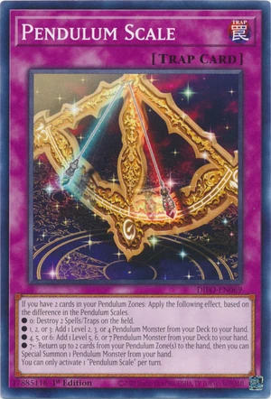 If you have 2 cards in your Pendulum Zones: Apply the following effect, based on the difference in the Pendulum Scales. ● 0: Destroy 2 Spells/Traps on the field. ● 1, 2, or 3: Add 1 Level 2, 3, or 4 Pendulum Monster from your Deck to your hand. ● 4, 5, or 6: Add 1 Level 5, 6, or 7 Pendulum Monster from your Deck to your hand. ● 7+: Return up to 2 cards from your Pendulum Zone(s) to the hand, then you can Special Summon 1 Pendulum Monster from your hand. You can only activate 1 "Pendulum Scale" per turn. |
