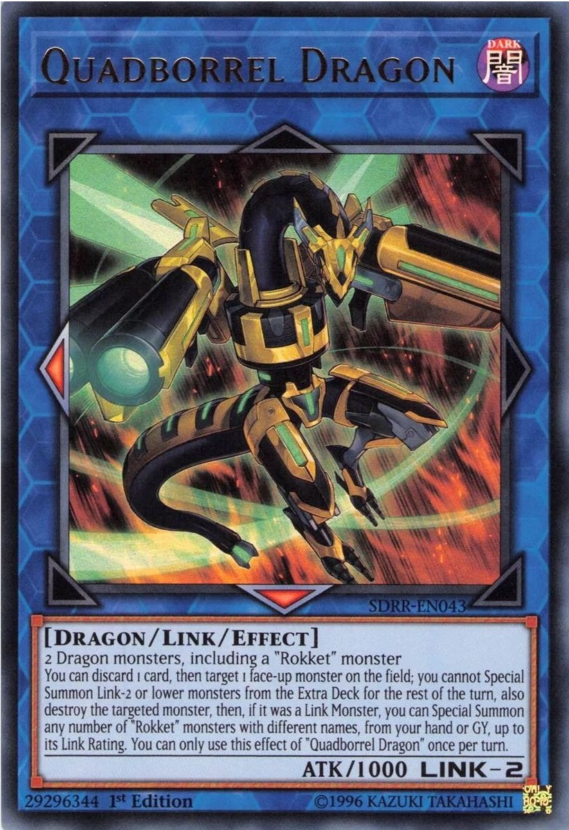 2 monstres Dragon (un monstre "Rokkette" inclus) Vous pouvez défausser 1 carte, puis ciblez 1 monstre face recto sur le Terrain ; vous ne pouvez pas Invoquer Spécialement de monstres de max. Link-2 depuis l'Extra Deck le reste de ce tour, et aussi, détruisez le monstre ciblé, puis, si c'était un Monstre Lien, vous pouvez Invoquer Spécialement un nombre de votre choix de monstres "Rokkette" de noms différents, depuis votre main ou Cimetière, inférieur ou égal à sa Classification Lien. Vous ne pouvez utiliser cet effet de "Dragon Quadroborrelle" qu'une fois par tour. |