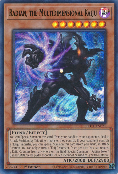 Puedes Invocar esta carta de Modo Especial (desde tu mano) al Campo de tu adversario en Posición de Ataque, Sacrificando 1 monstruo que él controle. Si tu adversario controla un monstruo "Kaiju", puedes Invocar esta carta de Modo Especial (desde tu mano) en Posición de Ataque. Sólo puedes controlar 1 monstruo "Kaiju". Una vez por turno: puedes retirar 2 Contadores Kaiju de cualquier lugar del Campo; Invoca de Modo Especial 1 "Ficha Radian" (Demonio/OSCURIDAD/Nivel 7/ATK 2800/DEF 0), pero no puede ser usada como Material de Sincronía. |