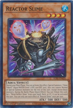 Während deiner Main Phase: Du kannst diesen Effekt aktivieren; beschwöre 2 „Schleim-Spielmarken“ (Aqua/WASSER/Stufe 1/ATK 500/DEF 500) als Spezialbeschwörung, zusätzlich kannst du für den Rest dieses Spielzugs keine Monster als Normal- oder Spezialbeschwörung beschwören, außer Göttliches Ungeheuer-Monstern. Während der Battle Phase (Schnelleffekt): Du kannst diese Karte als Tribut anbieten; setze 1 „Metallisch reflektierender Schleim“ von deiner Hand, deinem Deck oder deinem Friedhof. Er kann in diesem Spielzug aktiviert werden. Du kannst jeden Effekt von „Reaktorschleim“ nur einmal pro Spielzug verwenden. |