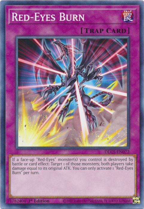 「レッドアイズ・バーン」は1ターンに1枚しか発動できない。①:自分フィールドの表側表示の「レッドアイズ」モンスターが戦闘・効果で破壊された場合、破壊されたそのモンスター1体を対象として発動できる。お互いのプレイヤーはそのモンスターの元々の攻撃力分のダメージを受ける。 |