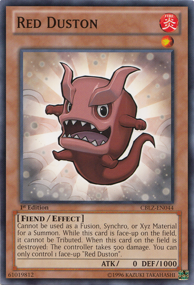 Kann nicht als Fusions-, Synchro- oder Xyz-Material für eine Beschwörung verwendet werden. Solange diese Karte offen auf dem Spielfeld liegt, kann sie nicht als Tribut angeboten werden. Wenn diese Karte auf dem Spielfeld zerstört wird: Ihr Beherrscher erhält 500 Schaden. Du kannst nur 1 offenes „Rotes Staubon“ kontrollieren.