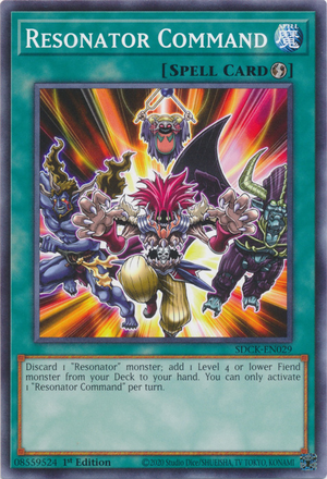 Descarte 1 monstro "Ressonador"; adicione 1 monstro Demônio de Nível 4 ou menos do seu Deck à sua mão. Você só pode ativar 1 "Comandar Ressonador" por turno. |