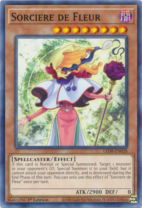 Si cette carte est Invoquée Normalement ou Spécialement : ciblez 1 monstre dans le Cimetière de votre adversaire ; Invoquez-le Spécialement sur votre Terrain, mais il ne peut pas attaquer directement votre adversaire, et il est détruit durant la End Phase de ce tour. Vous ne pouvez utiliser cet effet de "Sorcière des Fleurs" qu'une fois par tour.