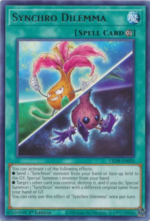 Vous pouvez activer 1 des effets suivants ; ● Envoyez 1 monstre "Synchronique" depuis votre main ou Terrain face recto au Cimetière ; Invoquez Spécialement 1 monstre depuis votre main. ● Ciblez 1 autre carte que vous contrôlez ; détruisez-la, et si vous le faites, Invoquez Spécialement 1 monstre "Synchronique" de nom d'origine différent depuis votre main ou Cimetière. Vous ne pouvez utiliser cet effet de "Dilemme Synchro" qu'une fois par tour. |
