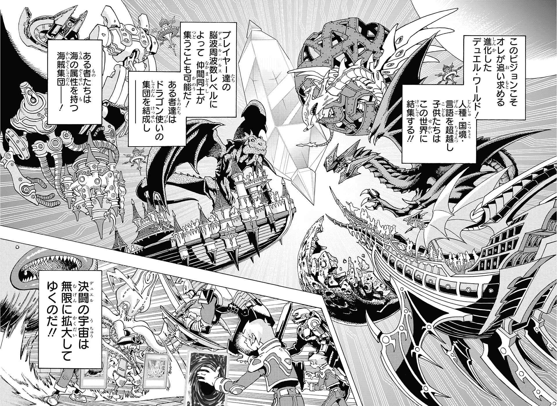 The group pass through a door into a bridge over a room, where the test subjects are sitting on the floor wearing the Neurons headgear. Kaiba explains that the electromagnetic coils of the Neurons gear detect brainwave activity, which it converts to electromagnetic signals. The image from the user's imagination is then linked to the Crystal Cloud Network to complete the VR Solid Vision. Mokuba further comments that with Neurons systems interacting with each other around the world, people who have never seen each other are Dueling in VR space, in the world Kaiba created; the world of Duel Links. He explains how Duelists can create Decks from card data sent across the cloud server and that they can even group together based on their brainwave frequency—their Duel pulse. People can form guilds, such as dragon users or pirates.