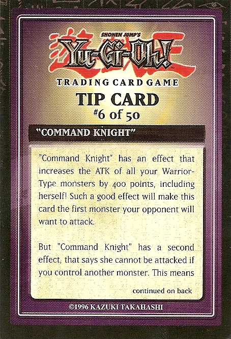 Tip Cards are double-sided non-game cards that contain helpful advice, tips, and combos that beginners (and maybe even some expert players) might not be aware of. They are included in some TCG reprint sets.