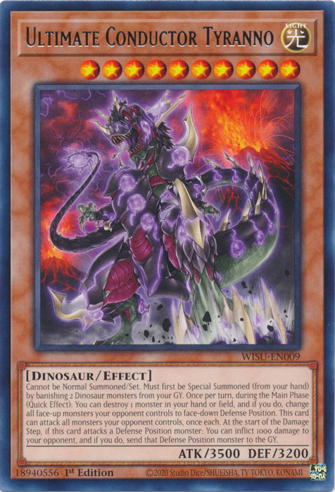 Non può essere Evocato Normalmente/Posizionato. Deve prima essere Evocato Specialmente (dalla tua mano) bandendo 2 mostri Dinosauro dal tuo Cimitero. Una volta per turno, durante la Main Phase (Effetto Rapido): puoi distruggere 1 mostro nella tua mano o Terreno e, se lo fai, metti coperti in Posizione di Difesa tutti i mostri scoperti controllati dal tuo avversario. Questa carta può attaccare tutti i mostri controllati dal tuo avversario, una volta ciascuno. All'inizio del Damage Step, se questa carta attacca un mostro in Posizione di Difesa: puoi infliggere 1000 danni al tuo avversario e, se lo fai, manda al Cimitero quel mostro in Posizione di Difesa. |
