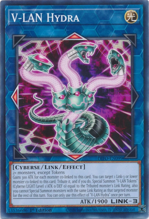 2+ Monster, außer Spielmarken Erhält für jedes mit dieser Karte kreuzgelinkte Monster 300 ATK. Du kannst 1 Monster mit Link-3 oder niedriger wählen, das mit dieser Karte kreuzgelinkt ist; biete es als Tribut an und falls du dies tust, beschwöre „V-LAN-Spielmarken“ (Cyberse/LICHT/Stufe 1/ATK 0/DEF 0) in Höhe der Linkzahl des als Tribut angebotenen Monsters als Spezialbeschwörung, zusätzlich kannst du für den Rest dieses Spielzugs keine Monster mit derselben Linkzahl wie jenes als Ziel gewählte Monster als Spezialbeschwörung beschwören. Du kannst diesen Effekt von „V-LAN-Hydra“ nur einmal pro Spielzug verwenden. |