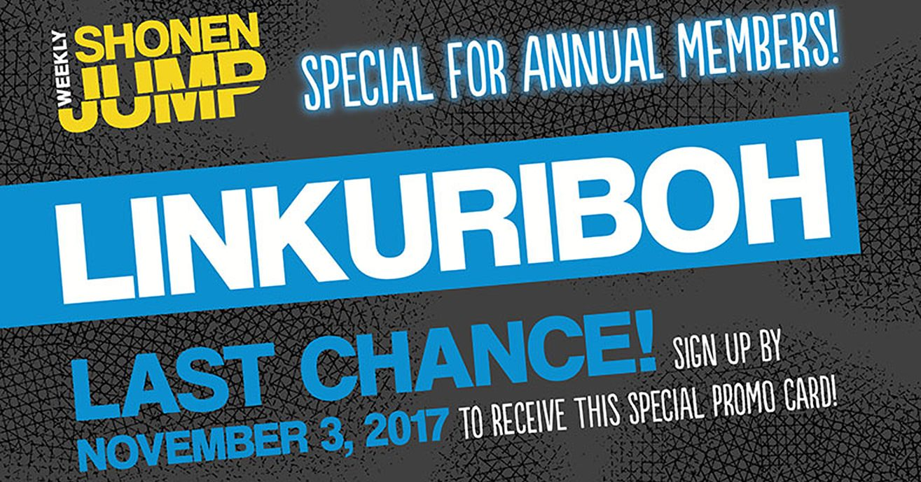 The Weekly Shonen Jump November 2017 membership promotional card is the nineteenth subscription promotional card with the Weekly Shonen Jump magazine, an Ultra Rare "Linkuriboh ". It was mailed to people who suscribed between July 6 and November 3, 2017.
