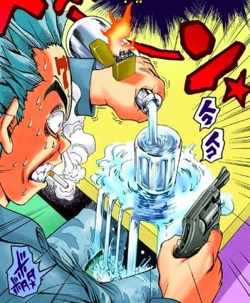 The convict accepts, and the rules of the game, one finger BATTLE!, are that each player must choose one finger, and can only move that one. Other than that, the players are free to do whatever they want. As Dark Yugi explains the rules, the convict puts a cigarette in his mouth and begins pouring the vodka into a glass. The convict chooses his index finger and Dark Yugi uses chooses his thumb. The convict is about to shoot Dark Yugi, until Dark Yugi flicks on a cigarette lighter with his thumb. The convict realizes that he didn't light his cigarette yet and orders Dark Yugi to light it for him. Dark Yugi places the lighter on the prisoner's arm. The prisoner now can't move because if the lighter hits the 90% alcohol (180 proof) Russian vodka, his body will be burn. Dark Yugi grabs Anzu and starts to walk away. The prisoner starts to say something, but the cigarette falls into the drink.