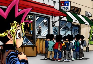 Yugi inserts the coin, but no capsule comes out. He starts to shake the machine in frustration, while the other kids all laugh at him. The store owner, "Old Man Dentures", arrives and thumps Yugi on the head. He asks if Yugi thinks that he will let him break the machine, just because he lost ¥100. He yells that the machine is expensive and worth more than Yugi. Yugi apologizes, but then asks himself why he is the one apologizing, when he is the one who lost money.