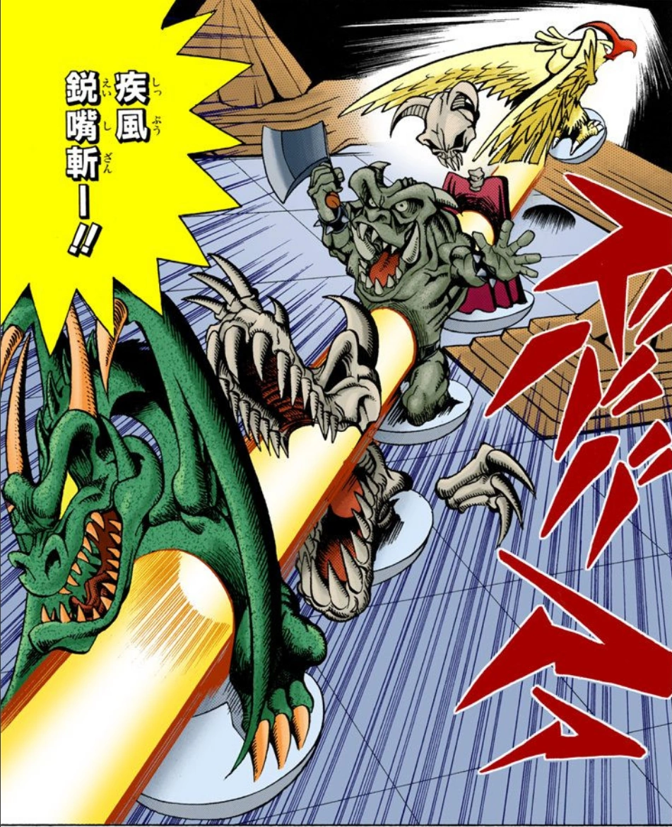 Dark Yugi's last monster is "Torigun". It is low Level, cannot make sharp turns and is terrible at close combat. However, it has one special talent. Once per game, it can defeat any number of enemies in one diagonal super attack. Mokuba realizes that Dark Yugi had sacrificed his monsters, just to draw his into a line. "Torigun" uses its "Whirlwind Razor Beak Slash" attack to blast its way through all of Mokuba's remaining monsters.