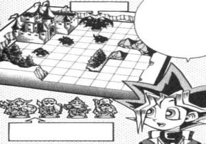 Jonouchi, Anzu, Yugi and Honda are impressed by the massive board he has set up, consisting of a village, a forest and a castle. Dark Bakura smiles and suggests that they start playing Monster World. "Or should I say a Shadow Game", he thinks to himself.