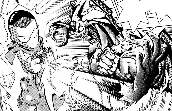 The game continues and its Honda's turn. Dark Bakura warns him that he might become frozen in fear by Zorc's powerful aura. Dark Bakura checks Honda's character's courage score and calculates that Honda must roll less than 70 to conquer his fear and go first. However if he rolls higher, Zorc will make the first attack. Honda rolls a 94 and calls it stupid because he isn't really afraid of Zorc. Dark Bakura laughs and says that there is no "you", only "your character". He narrates that the magic gunman is frozen in fear and curses his cowardice.