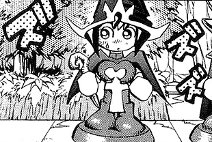 Anzu has just fallen unconscious while playing Monster World. Yugi, Jonouchi and Honda rush to check on her, while Dark Bakura laughs silently to himself. Yugi suspects something and shouts at Dark Bakura, asking what he did to Anzu. Dark Bakura innocently says that he's the Game Master and just followed the rules to keep the game going. However he adds that the game they are playing right now is the ultimate role-playing game. Yugi, Jonouchi and Honda look at him in shock and wonder what this means. Dark Bakura reminds them that he said in role-playing games you have to become the characters and elaborates that you transcend reality to become the people of an imaginary world and live the adventure that unfolds. Not seeing the relevance, Jonouchi reminds him that they are asking what he did to Anzu. Dark Bakura tells them to worry as Anzu is alive, but in Monster World.