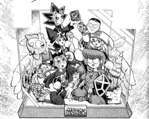 In class, Bakura greets the others, who are happy to see that he got the bandage taken off his left hand. He says that he has something to show them and holds up a diorama he made of their adventure that he made as a symbol of their friendship when they fought together. The diorama contains models of his, Yugi, Anzu, Jonouchi and Honda's characters, Pokii, Pao and one of Dark Yugi holding a die. He invites his friends to go with him again someday to Monster World.