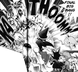 Dark Yugi continues the game and points out that he cannot see the Super Critical that Dark Bakura rolled and with no roll from Dark Bakura, his side continues to attack. He channels all his anger into Anzu's last attack and she uses her "Final Big Bang" attack to destroy Last Zorc.